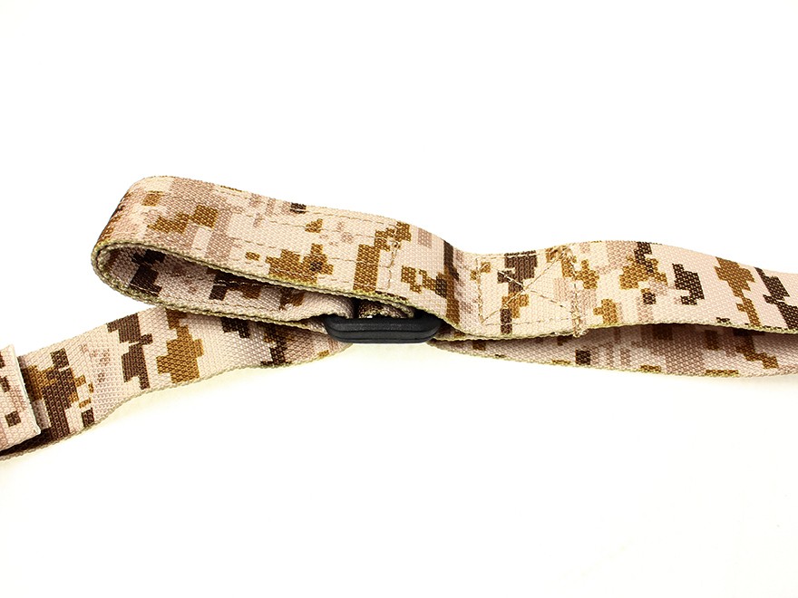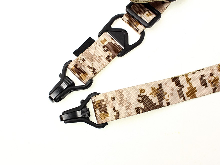 1ポイントと2ポイントを簡単に切替が可能なマルチポイントスリングです。ロック機能付きのフックが2箇所についており、ガンへの脱着がスムーズに行なえます。