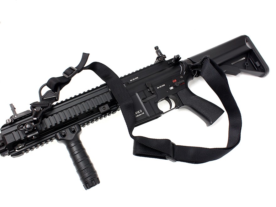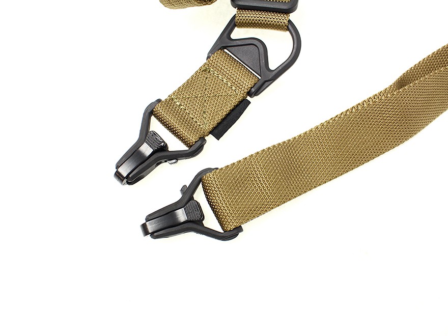 1ポイントと2ポイントを簡単に切替が可能なマルチポイントスリングです。ロック機能付きのフックが2箇所についており、ガンへの脱着がスムーズに行なえます。