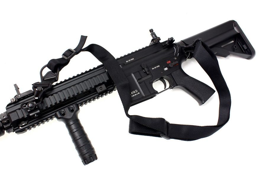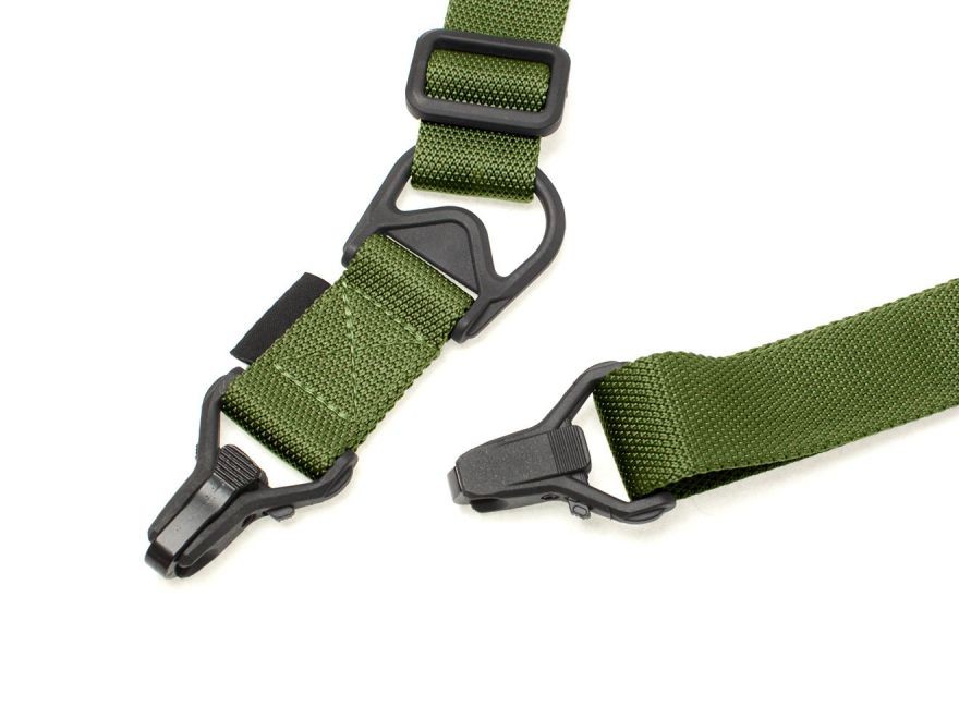 1ポイントと2ポイントを簡単に切替が可能なマルチポイントスリングです。ロック機能付きのフックが2箇所についており、ガンへの脱着がスムーズに行なえます。
