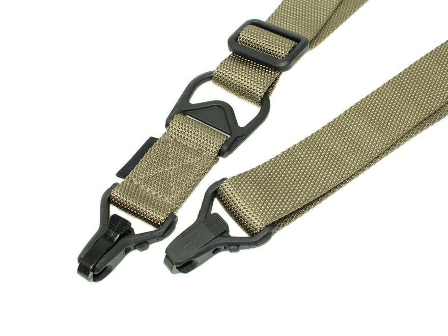 1ポイントと2ポイントを簡単に切替が可能なマルチポイントスリングです。ロック機能付きのフックが2箇所についており、ガンへの脱着がスムーズに行なえます。