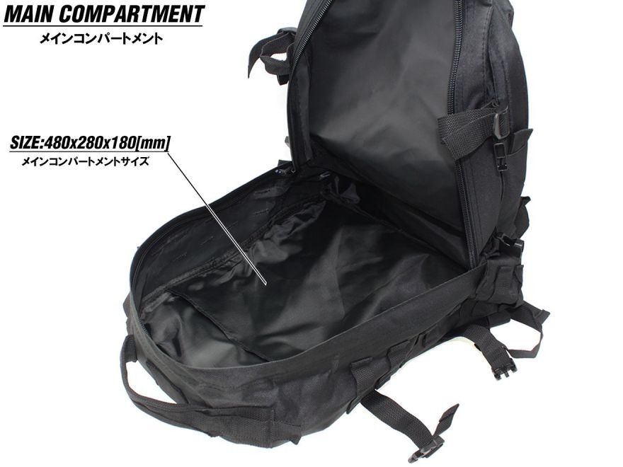 3日間分の任務遂行に必要な装備・食料などを携行できるよう設計されたバックパックです。パッドやBDU、シャツやタオルなどの着替えを入れてもまだ余裕があるくらいの容量があります。