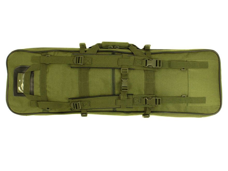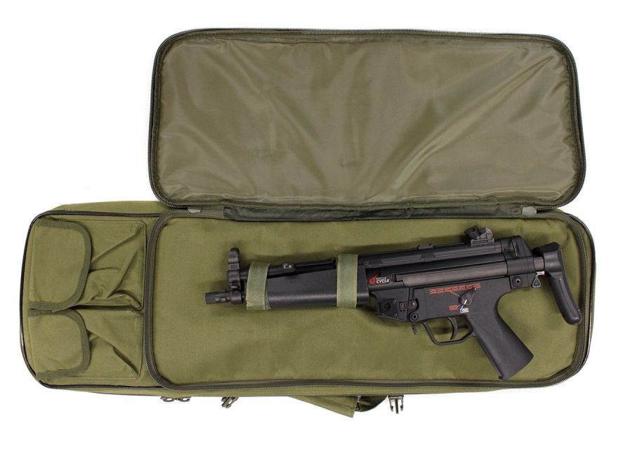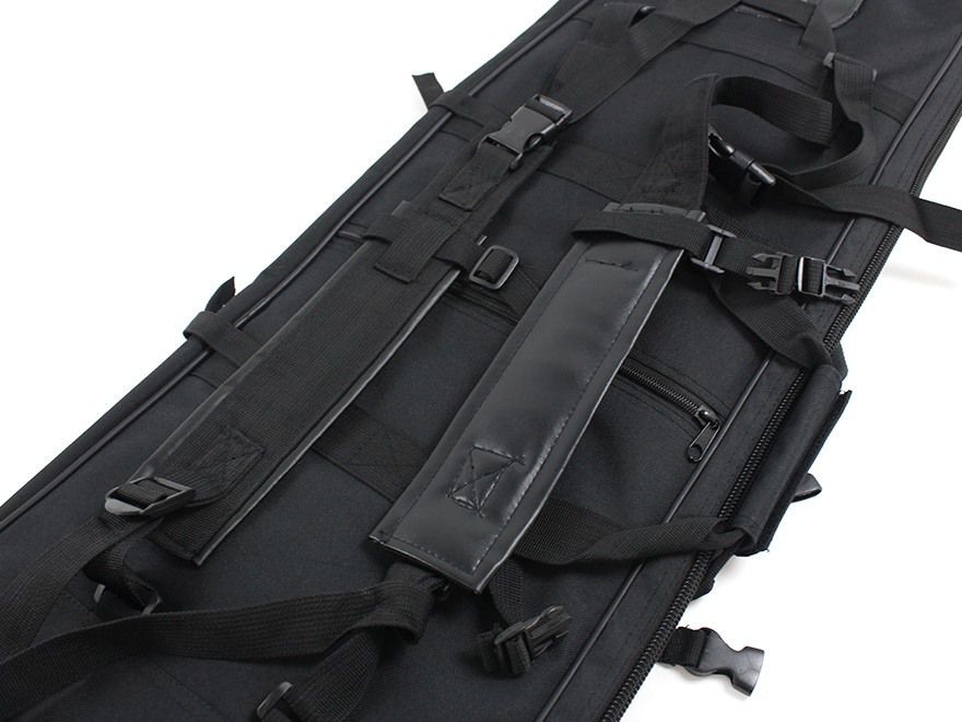 メインスペースは85cmのライフルスペース。ハンドガード部で固定するベルクロバンドが2本設置されています。また、はみ出てしまっても銃口露出しないよう15cm程度のフードがあります。多少長さがオーバーしても大丈夫!サブスペースには62cm以内のSMGを収納可能。こちらもハンドガード部を固定するベルクロバンドが2本設置されています。どちらのスペースもウレタンで囲まれているので2本がガチャガチャとあたるようなこともありません。