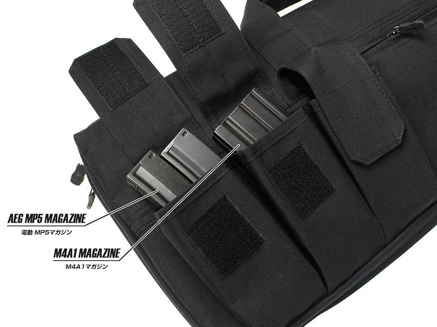 その代わりにケース側面に3本のマガジンポーチが設置されています。MP5のマガジンであれば各ポーチに2本ずつ収納可能です。