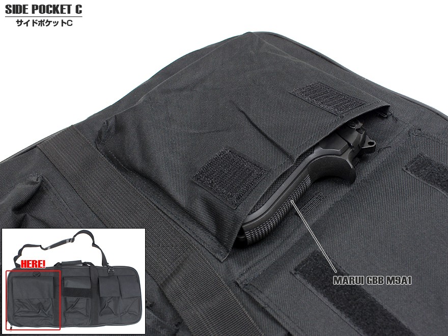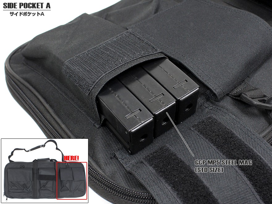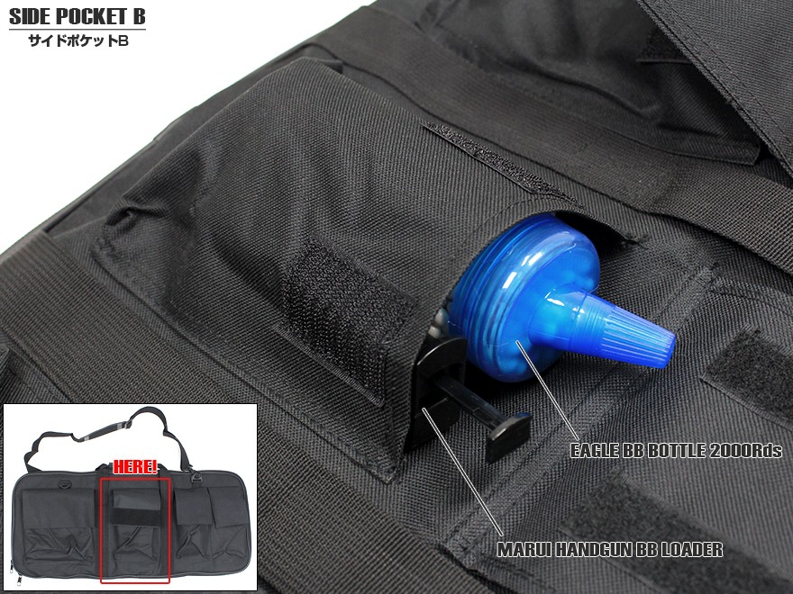 ケース側面にはSMGマガジンが2本入るポーチが2つ、工具などを入れるポーチが1つ、BBボトルやガス缶が入るポーチが1つ設置されており、サバゲに必要なガンアイテムを大方収納することができます。
