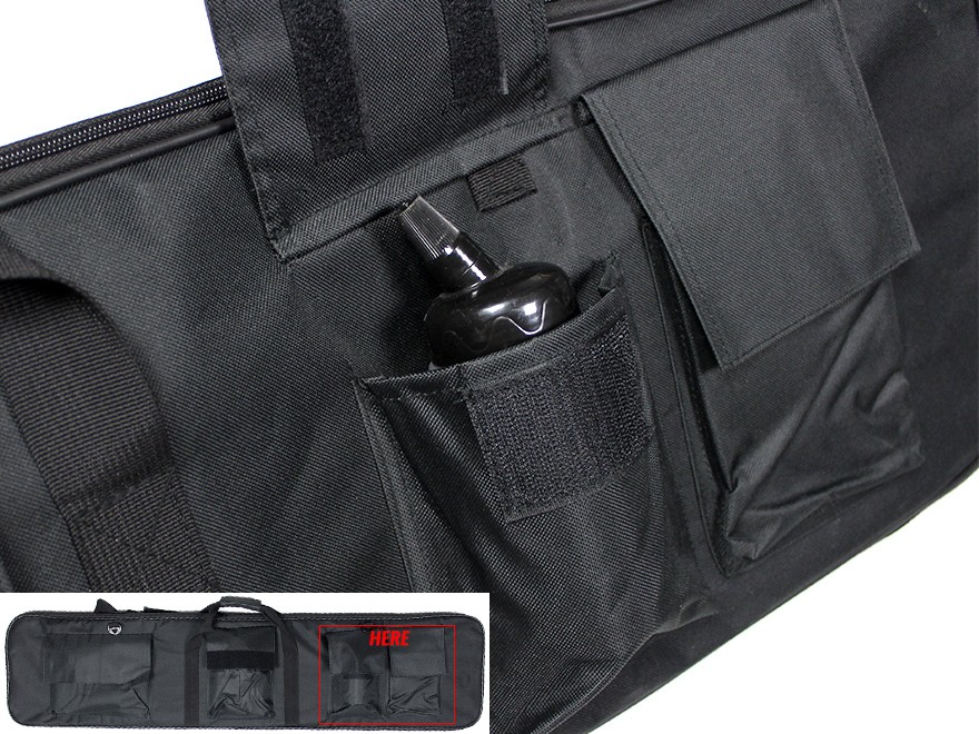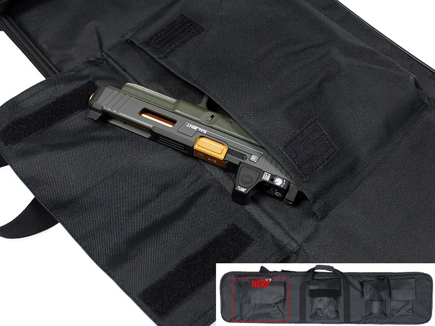ケース側面にはBBボトルや250gガス缶などが入るポーチが2つ、グローブや予備マガジンなどが入るポーチが1つ、ミドルサイズのハンドガンがすっぽり入るポーチが1つ設置されており、スポーツシューティングに必要なガンアイテムを合わせて収納することができます。