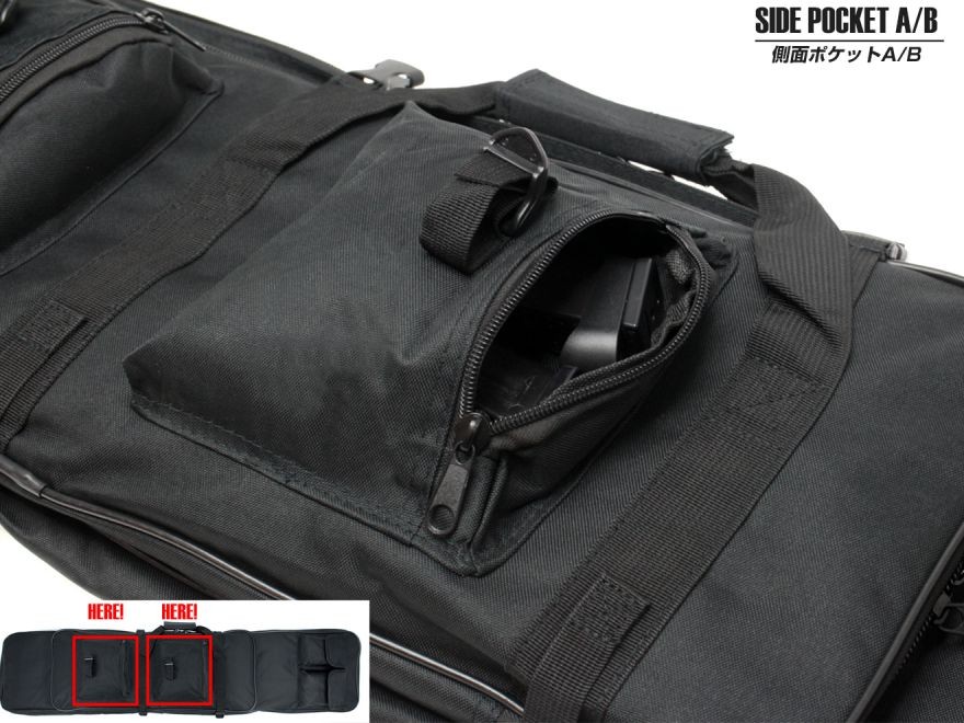 外部にも収納スペースが多々あります。ハンドガンマガジンや工具類、またはグローブなど厚みがあるものでも収納できる側面ポケットがサブスペースのフラップに2箇所。40mmモスカートやBBローダー等が収納可能なスペースが2箇所。予備マガジンなど薄手のものを収納できるロングスペースが1箇所と非常にユーティリティの高いケースになっています。