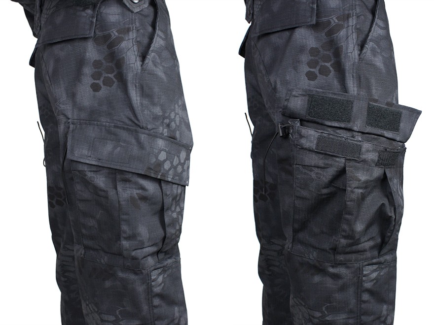 ジャケット袖口はベルクロ、パンツ裾口はバンドを配置。体格や使用するブーツに合わせることでカッコよく着こなすことができます!またブッシュにも引っかかりにくくなります。