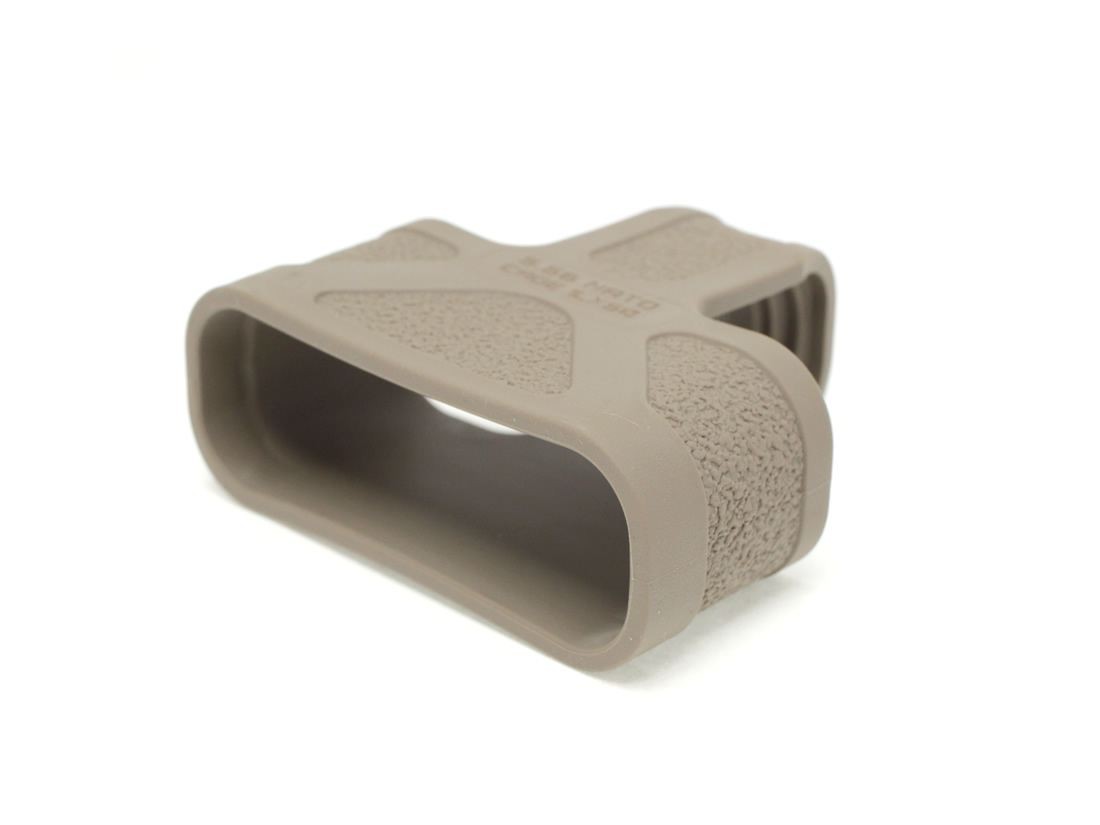 マガジンに装着させるコトで、マガジンポーチやタクティカルベストから素早く取り出すことができ、側面の凹凸になった面は掴んで引き抜く際の滑り止めになります。