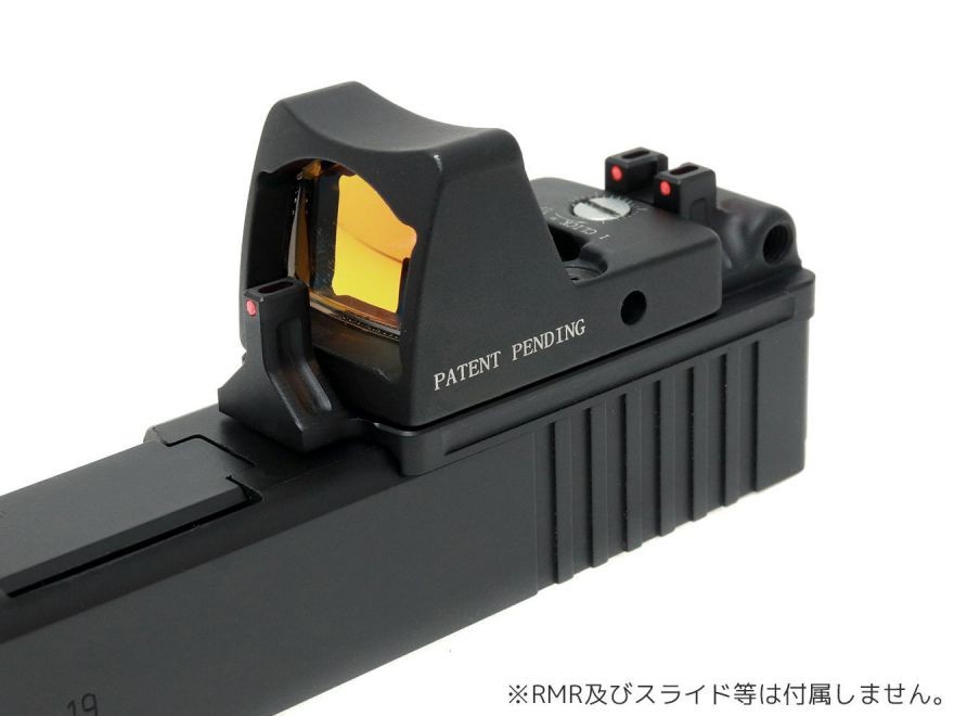 ノーマルスライドにRMR(タイプ)ミニリフレックスサイトを取り付けることが可能になるマウントです。しかも、RMRの前後にファイバーアイアンサイトも設置されています。万が一RMRに故障や電池切れなどが発生してもサイティング可能なようになっています。