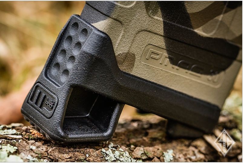 前方に張り出した独特のデザインを持つMAGPOD(マグポッド)ベースプレートを装着しています。ただのプレートではなくモノポッドとしてマガジンを活用できるスグレモノです。ラバーオーバーモールドとディンプルパターンでグリップに優れており、安定した射撃を可能にします。