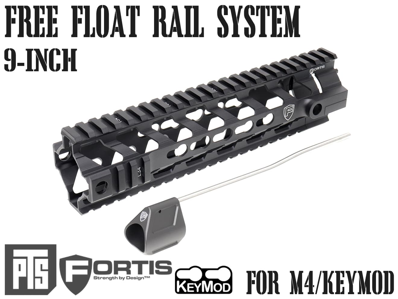 PTS FORTIS REV フリーフロートレールシステム 9インチです。各社リアルサイズ系M4シリーズのデルタリングに取り付け可能です。デルタリングが元からついていれば、ピッチやネジサイズを気にする必要がないので幅広い機種に取り付けが可能です。